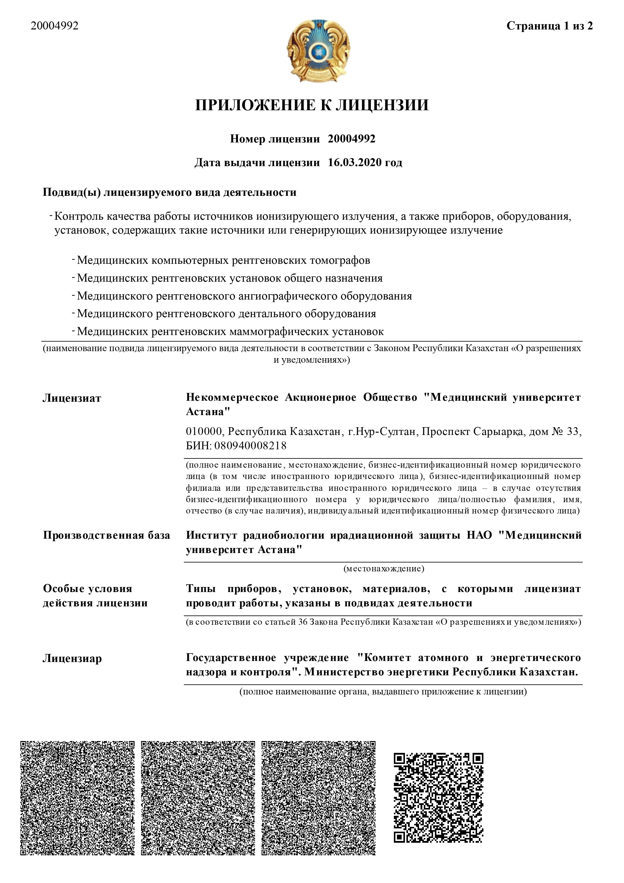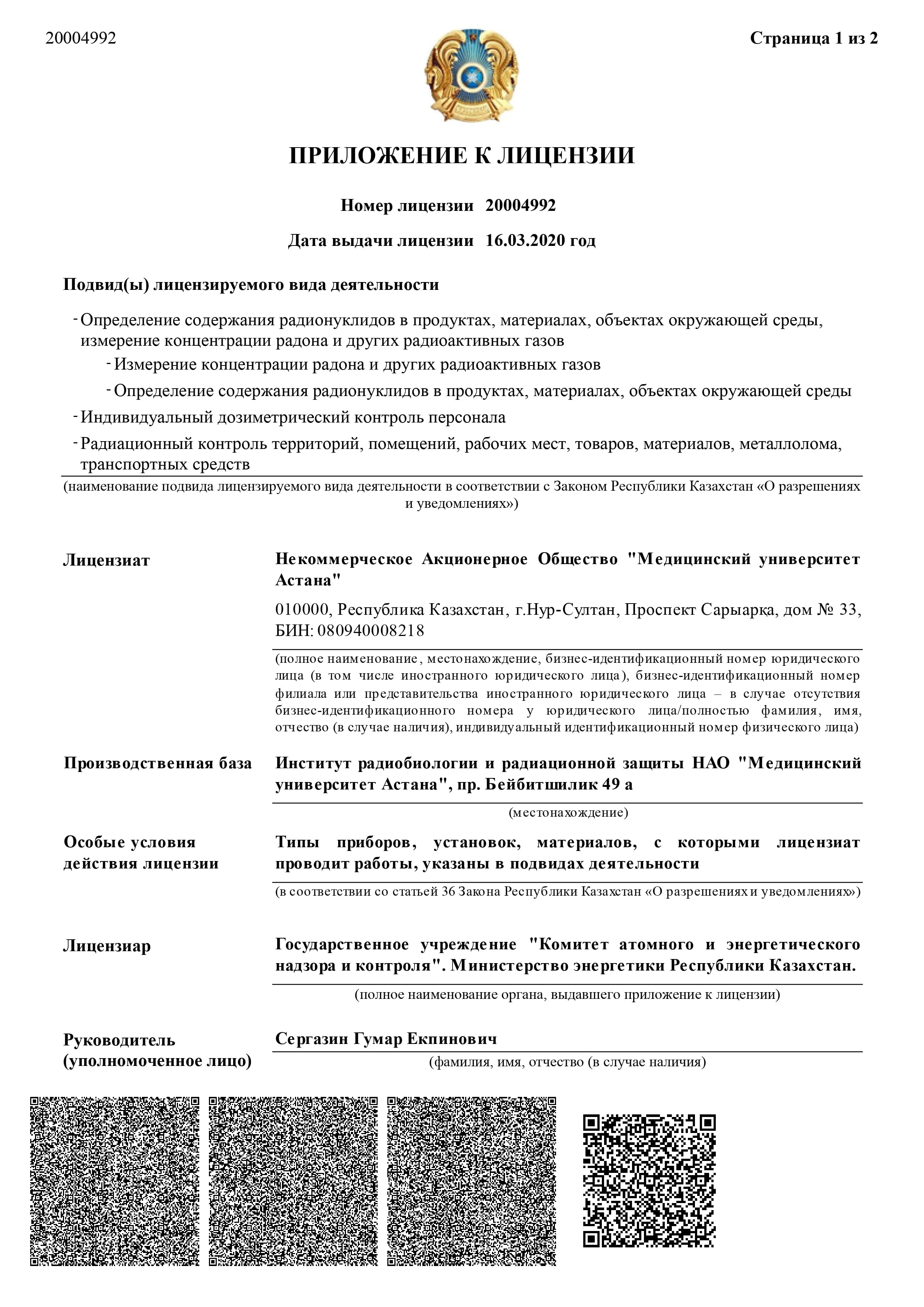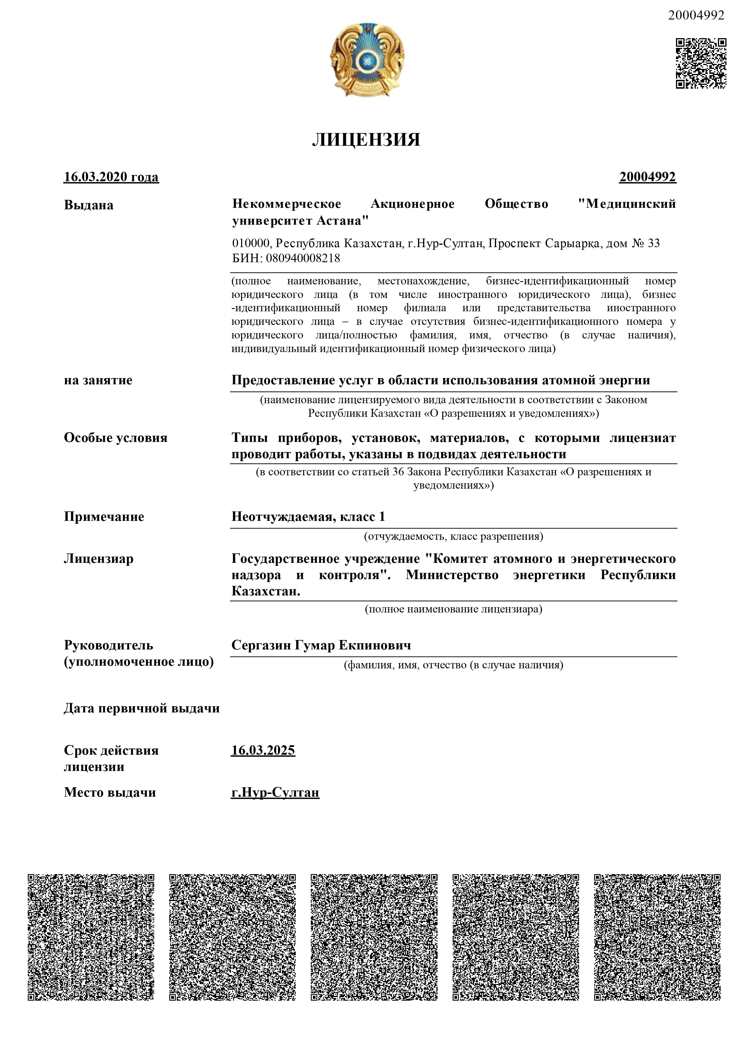 Комитета атомной энергетики МИНТ РК на занятие «Предоставление услуг в области использования атомной энергетики» №20004992 от 16.03.2020 г.